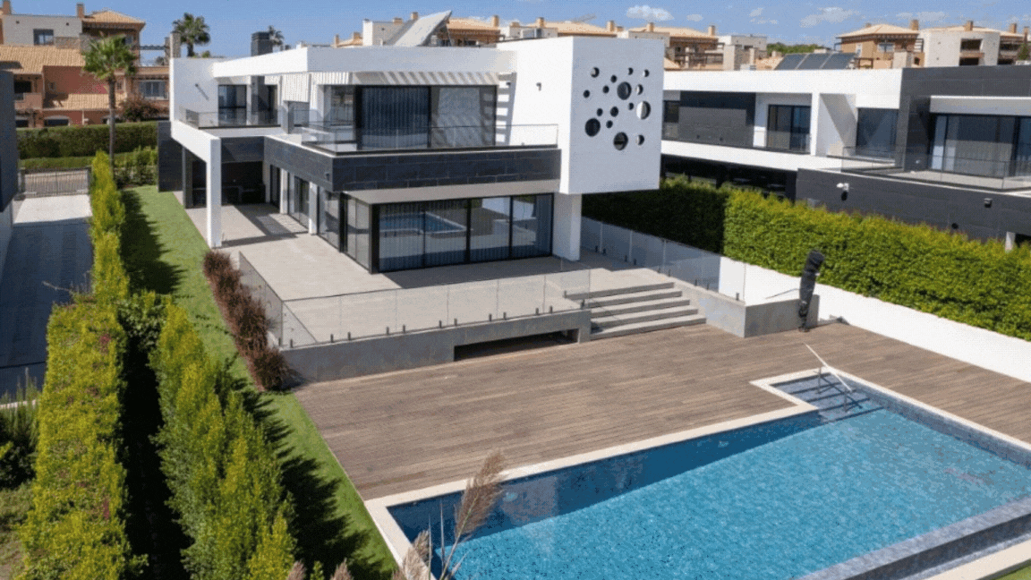 The villa spreads across three levels and offers four large ensuite bedrooms plus a versatile additional room that could be used as an office, gym, or extra bedroom.